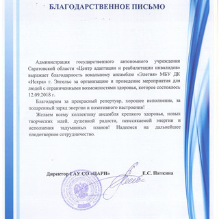 Сегодня, 12 сентября 2018г. вокальный коллектив «Элегия» Дома Культуры «Искра» выступил с сольным концертом в реабилитационном центре города Саратова «Парус надежды». Так же концерт украсил своими завораживающими номерами танцевальный коллектив «Фортэс Нэво»